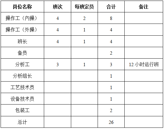 裝置定員不考慮行政管理人員,設(shè)備維修維護(hù)人員。如果裝置自動化程度設(shè)置較高,設(shè)備可靠性好,人員可減少。