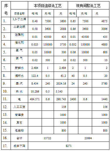 連續(xù)法工藝和間歇法工藝主要原材料消耗對比如下表: