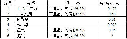 丁二烯、二氧化硫、阻聚劑按一定比例經(jīng)泵送入合成環(huán)丁烯砜的連續(xù)反應(yīng)器中,在一定壓力、溫度條件下原料在反應(yīng)器內(nèi)轉(zhuǎn)化成環(huán)丁烯砜。
