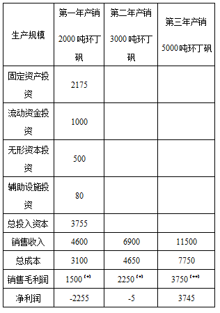 1、由于環(huán)丁砜市場銷售應(yīng)屬于逐步進(jìn)入的方式,因此未考慮當(dāng)年達(dá)產(chǎn)。如果市場開發(fā)的實際能力較強,盈利預(yù)期可以相對提前。